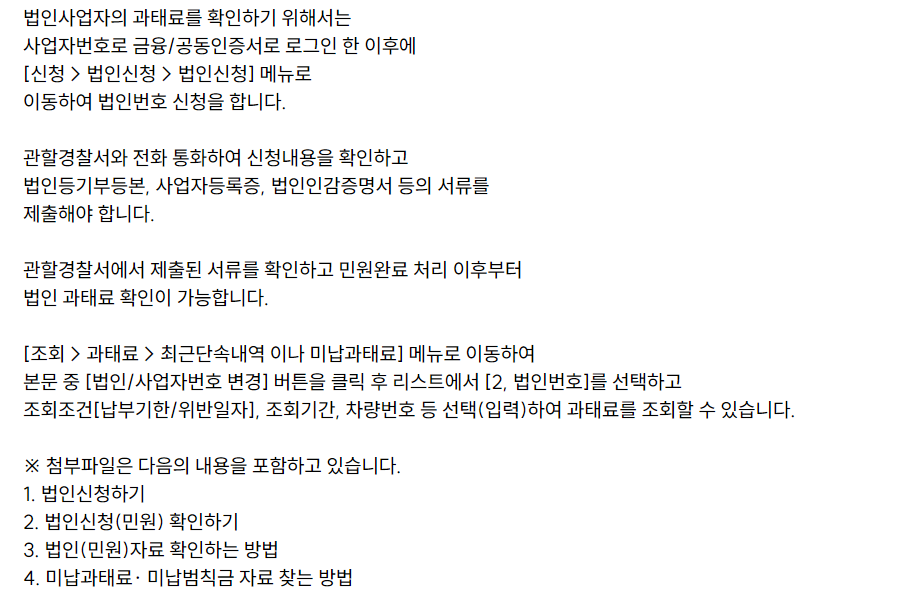 관할 경찰서와 유선 통화 후 신청내용을 확인하고 법인등기부등본, 사업자등록증, 법인인감증명서 등의 구비 서류를 제출하면 민원 완료 처리 이후부터 법인 과태료 확인 가능합니다.