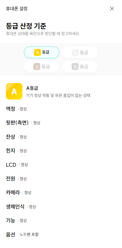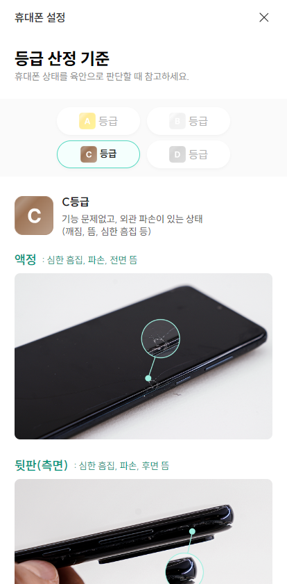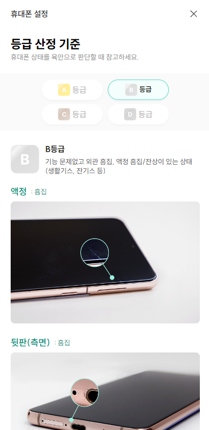 또한, 휴대폰 상태를 육안으로 판단할 때 상기 사진을 참고하면 자신의 기기 상태에 맞는 가격대를 조금 더 정확하게 알 수 있답니다.