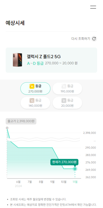 내가 입력한 정보로 조회된 시세는 매주 월요일에 변경될 수 있고, 해당 시세조회는 예상치로 정확한 진단가격은 민팃ATM에 휴대폰을 넣은 후에 확인 가능합니다. 덧붙여 최신 휴대폰의 경우, 적어도 출시 3개월 이후부터 판매 가능합니다.