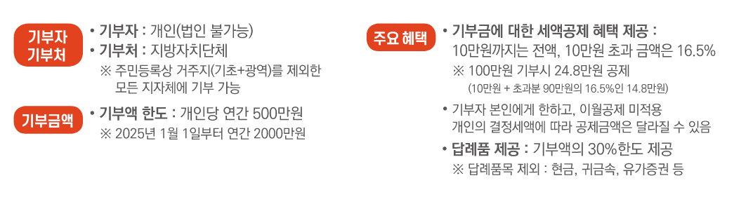 기부자는 자신이 현재 거주하지 않는 지역(타 지역)에 최대 500만 원까지 기부할 수 있으며, 기부를 통해 지역 사회의 다양한 사업을 지원하게 됩니다.