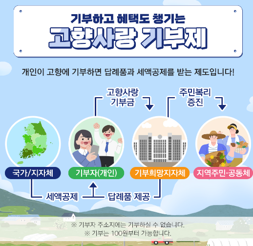고향사랑 기부제는 지역 주민과 외부인이 함께 지역을 살리는 뜻깊은 기부 활동입니다.