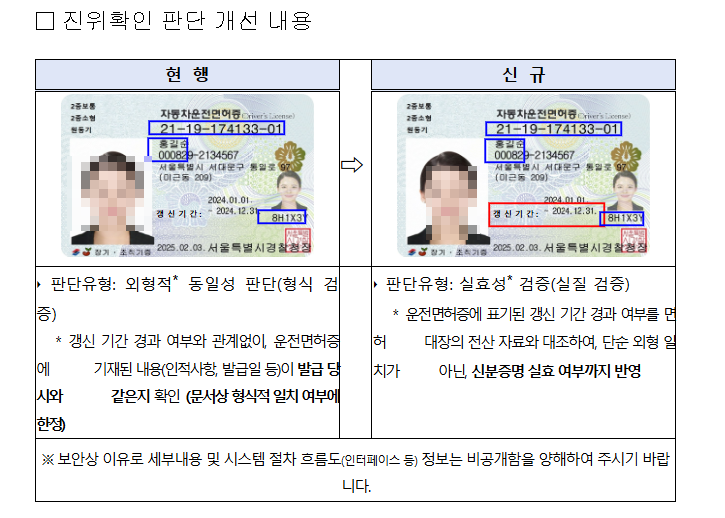 지금까지는 갱신 기간이 지나더라도 면허증에 기재된 정보가 발급 당시와 동일하면 단순히 ‘일치’로 확인되어 신분증으로 사용할 수 있었습니다. 그러나 이는 주민등록증이나 여권과 비교했을 때 형평성 문제가 제기되어 왔습니다.