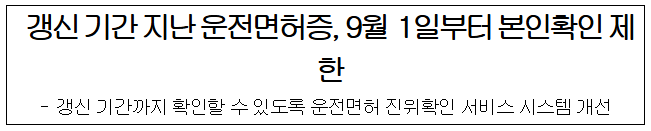 경찰청은 이러한 문제를 개선하기 위해 오는 2025년 9월 1일부터는 운전면허 진위여부조회 서비스에서 갱신 기간을 확인하고, 갱신이 지나면 본인확인 기능을 제한하기로 했습니다. 즉, 갱신하지 않은 면허증을 은행이나 관공서에서 신분증으로 사용하려고 할 경우 더 이상 인정받지 못할 수 있다는 의미입니다.