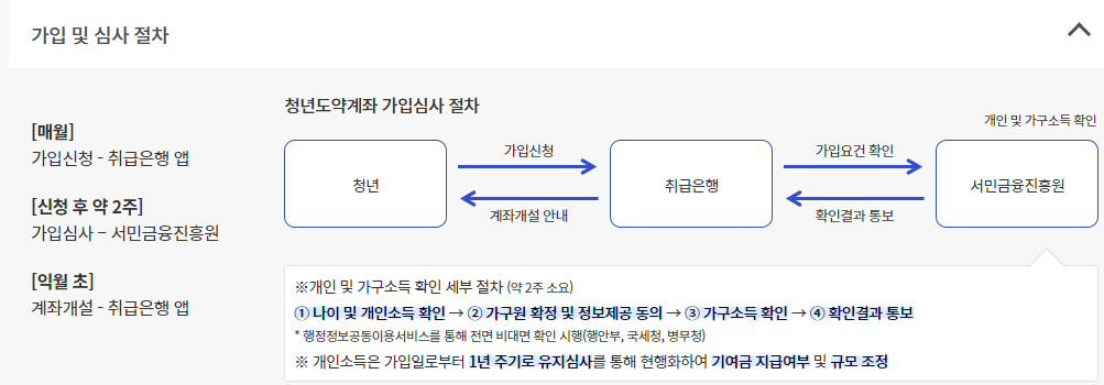 청년도약계좌 가입심사는 및 세부 절차는 약 2주 소요됩니다. 나이 및 개인소득 확인 후 가구 소득을 확인해서 확인 결과가 통보 되는 구조입니다. 개인소득은 가입일로부터 1년 주기로 유지심사하며 기여금 지급여부 및 규모를 조정합니다.