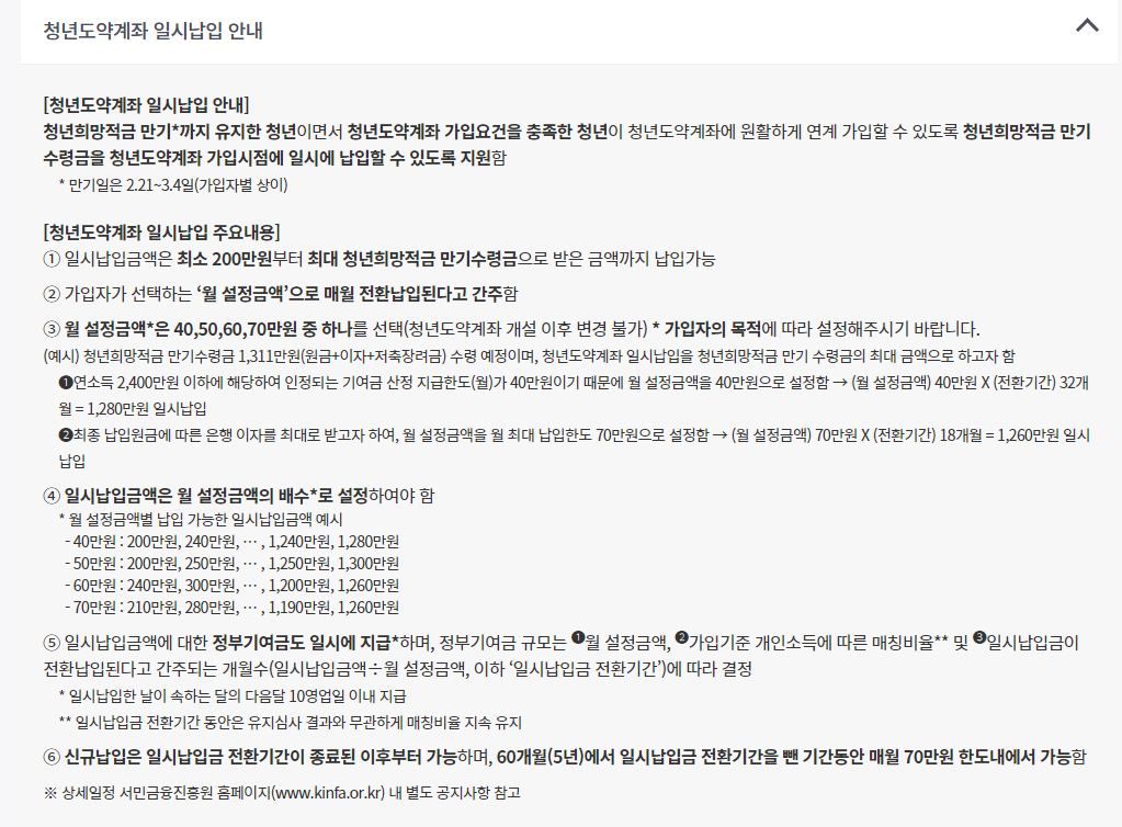 청년도약계좌 일시 납입 금액은 최소 200만원부터 최대 청년희망적금 만기수령금으로 받은 금액까지 납입 가능합니다. 가입자가 선택하는 '월 설정금액'으로 매월 전환납입된다고 간주하는 것인데요, 월 설정금액은 40,50,60,70만원 중 하나로 선택하게 됩니다.