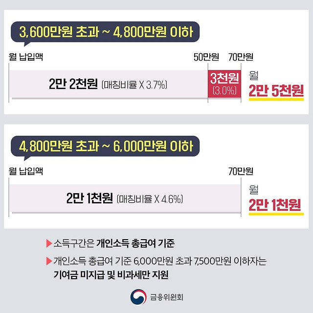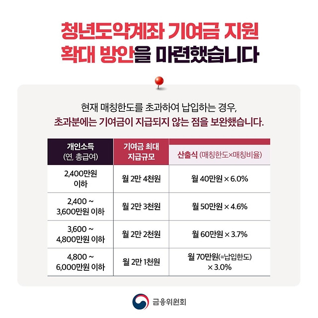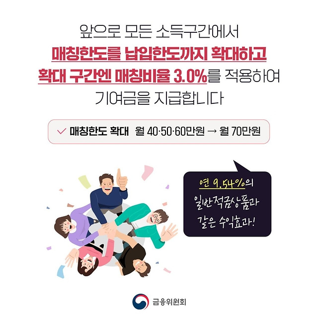 현재 매칭한도를 초과하여 납입하는 경우, 초과분에는 기여금이 지급되지 않는 점을 보완했습니다. 앞으로 모든 소득구간에서 매칭한도를 납입한도까지 확대하고 확대 구간엔 매칭비율 3.0%를 적용하여 기여금을 지급받을 수 있습니다. (매칭한도 확대 월 40·50·60만 원에서 월 70만 원으로 늘어났고 이는 연 9.54%의 일반적금상품과 같은 수익효과입니다.)
