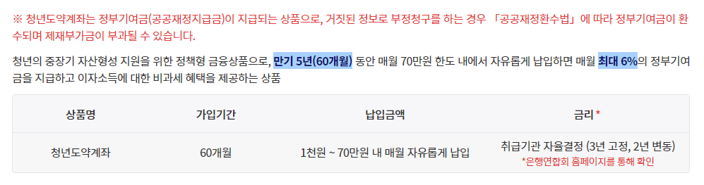 청년도약계좌는 청년의 중장기 자산형성 지원을 위한 정책형 금융상품입니다. 만기 5년(60개월) 동안 매월 70만원 한도 내에서 자유롭게 납입하면 고금리 정부기여금을 지급하고 이자소득에 대한 비과세 혜택을 제공하는 정부 상품입니다.