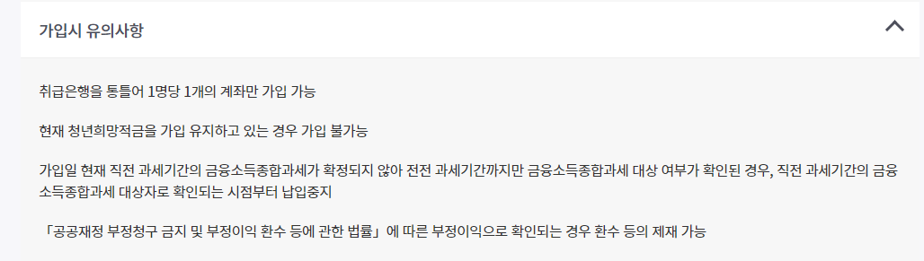 가입 시 유의사항도 확인해봐야 하는데요, 청년도약계좌는 현재 청년희망적금을 가입 유지 하고 있는 경우 가입 불가합니다.