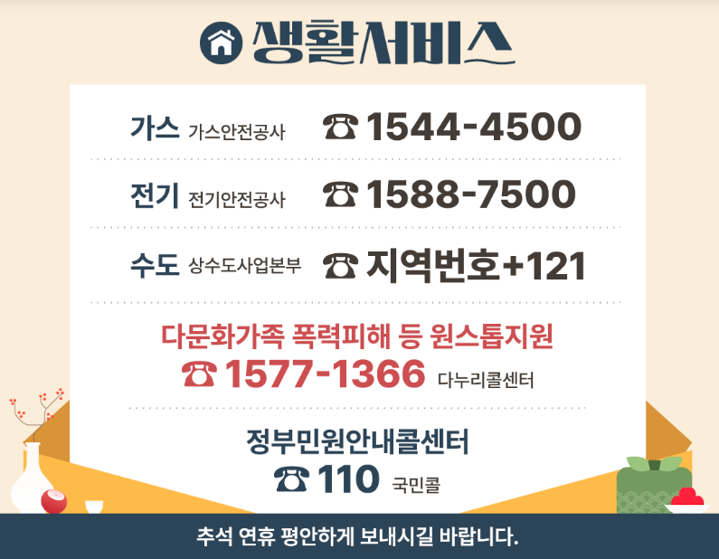 가스, 전기, 수도 생활서비스 전반에 대한 긴급한 상황이 발생했을 때, 각 1544-4500, 1588-7500, 지역번호+121 로 전화하시면 답변 받으실 수 있습니다. 다문화가족 폭력피해 등 원스톱지원 서비스와 정부민원안내콜센터 110도 열려있습니다.