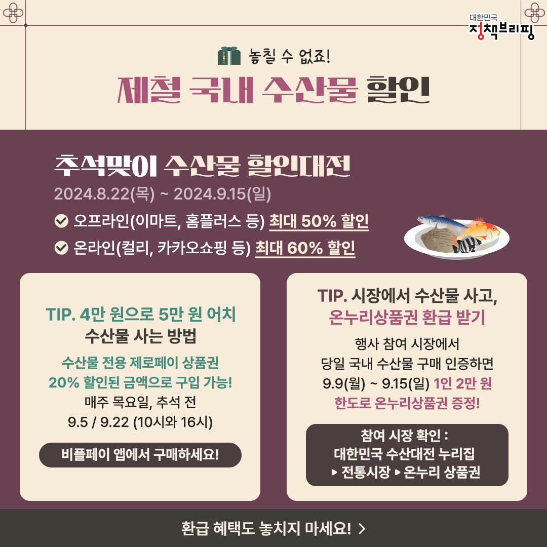· 추석맞이 수산물 할인대전: 2024.8.22(목) ~ 2024.9.15(일)