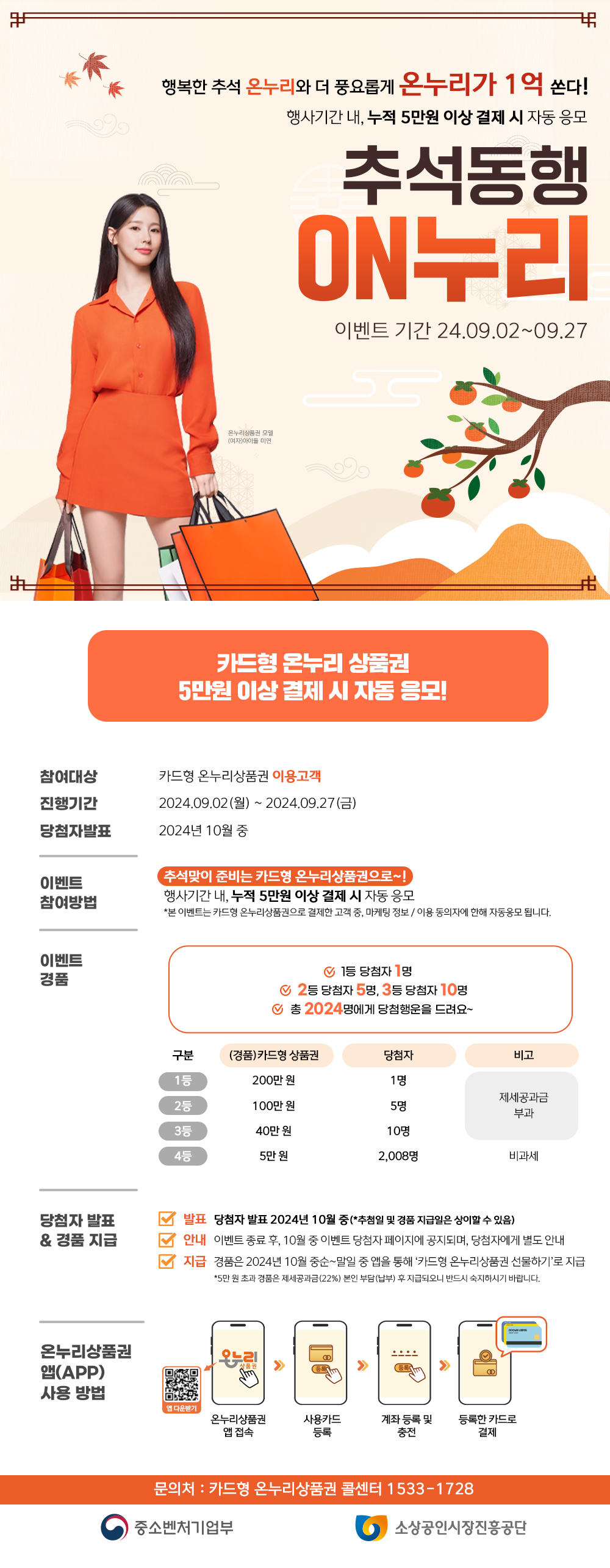 이벤트 기간 2024.09.02 ~ 09.27 으로 카드형 온누리 상품권 5만원 이상 결제 시 자동 응모 되는 이벤트 입니다. 당첨자는 2024년 10월 중 발표되며 1등 당첨자 1명, 2등 5명, 3등 10명, 총 2024명에게 혜택을 돌려주는 행사입니다. 혜택많은 신용카드 처럼 사용할 수 있는 온누리상품권 카드 추천 드립니다.