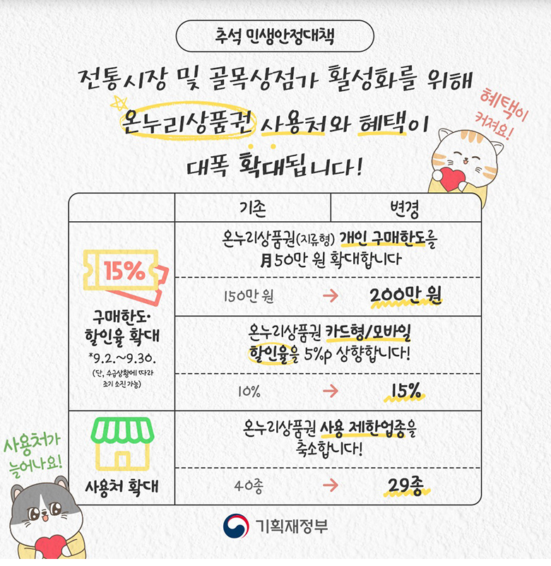 1. 온누리상품권 구매 한도·할인율 확대(9.2.~9.30.) *단, 수급 상황에 따라 조기 소진 가능