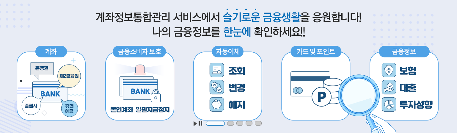 계좌정보 통합관리서비스는 개인이 보유한 모든 은행 계좌 정보를 한 곳에서 조회하고 관리할 수 있는 서비스로, 카드포인트 통합조회 시스템과 함께 사용하면 더욱 편리합니다. 이 서비스는 금융감독원과 금융결제원이 공동으로 제공하는 시스템으로, 각 은행의 계좌 정보를 통합적으로 확인하고, 필요에 따라 해지 또는 관리할 수 있습니다.