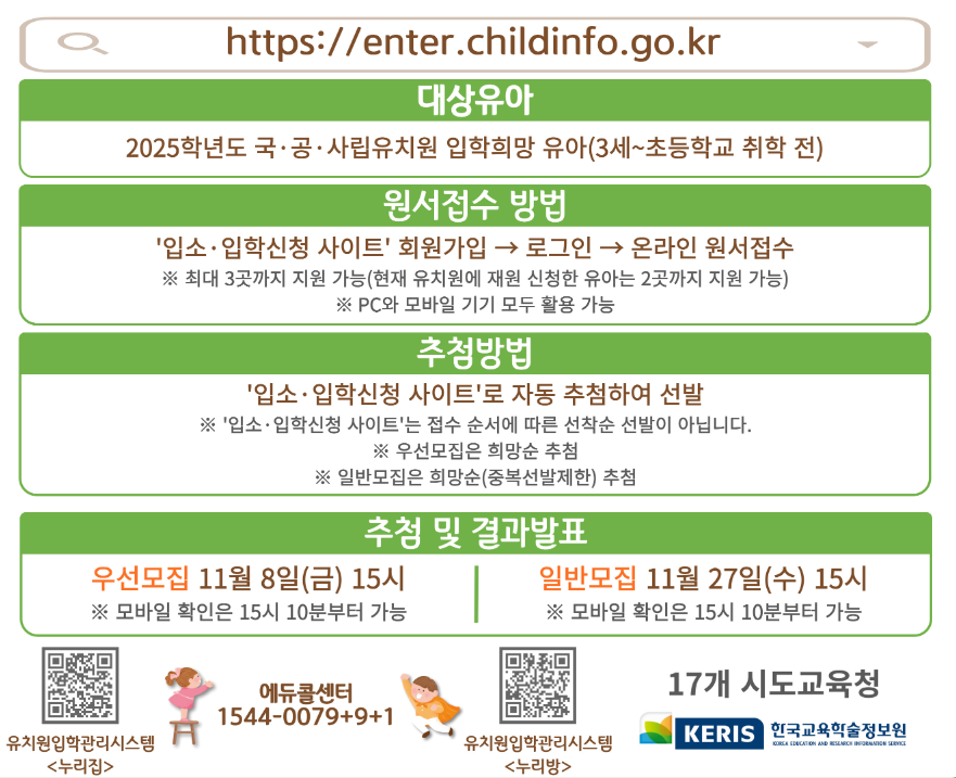 일반모집: 일반모집은 2024년 11월 20일부터 11월 22일까지 진행되며, 우선모집에서 배정되지 않은 경우 일반모집에 참여할 수 있습니다. 신청이 완료되면 자동 추첨으로 결과가 결정되며, 선발된 유치원에 등록해야 합니다.