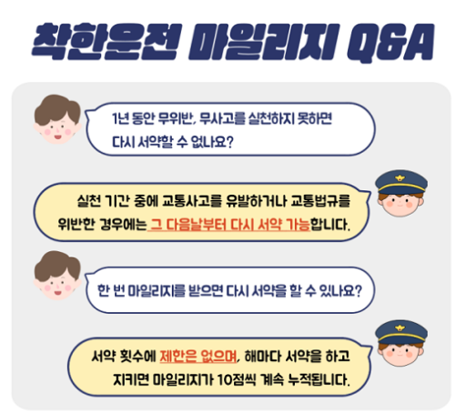 또한, 이미 벌점이 있더라도 착한운전 마일리지를 신청할 수 있으며, 이후 1년간 교통법규 위반이 없을 경우 혜택을 받을 수 있습니다.