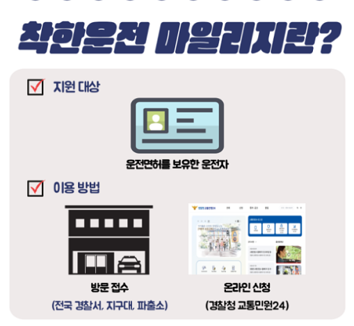 "착한운전 마일리지"는 인터넷으로 쉽게 신청할 수 있습니다. 경찰청 교통민원24 홈페이지(또는 '이파인' 사이트)에서 신청이 가능합니다.