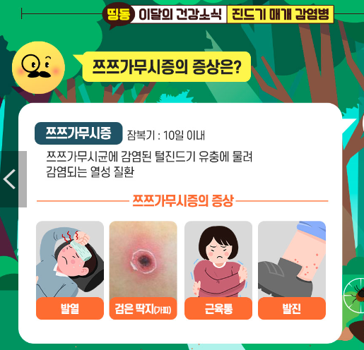 주로 아시아 지역에서 발생하며, 한국에서도 가을철에 많이 발생하는 전형적인 질병입니다. 쯔쯔가무시의 주요 증상은 고열, 두통, 발진, 그리고 물린 부위에 가피가 생기는 것이 특징입니다. 가피는 검은색 딱지가 생기는 형태로, 물린 부위 주변에 뚜렷하게 나타납니다.