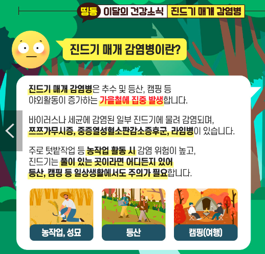 진드기는 주로 야생동물의 피를 먹고 살며, 숲이나 들판에서 사람의 피부에 붙어 병을 옮기기 때문에 야외 활동 시 진드기 예방이 매우 중요합니다.