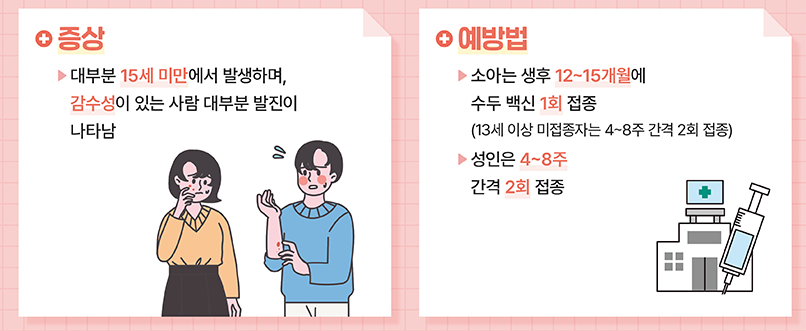 수두와 볼거리는 전염성이 높은 질환으로, 특히 어린이와 성인 모두에게 발생할 수 있습니다. 예방 접종은 수두와 볼거리로부터 자신과 타인을 보호하는 가장 효과적인 방법이며, 접종을 통해 감염 위험을 줄이고 합병증을 예방할 수 있습니다. 질환의 증상이 나타나면 즉시 안정을 취하고, 자가 격리와 위생 관리를 철저히 하여 전파를 막는 것이 중요합니다.