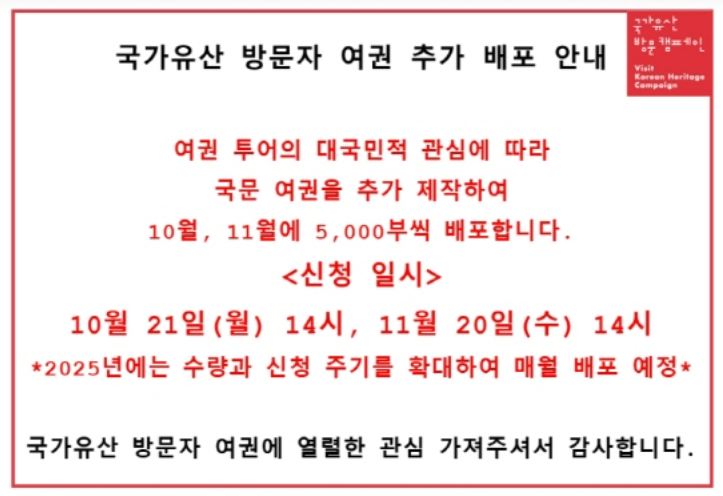 국가유산방문자 여권은 문화재청에서 추진하는 프로그램으로, 다양한 문화유산을 방문하면서 기록을 남길 수 있는 일종의 '패스포트'입니다.