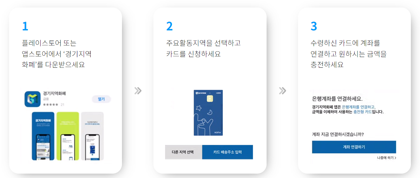 경기지역화폐 카드는 온라인 신청과 오프라인 발급 두 가지 방법으로 발급받을 수 있습니다.