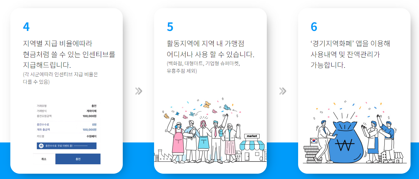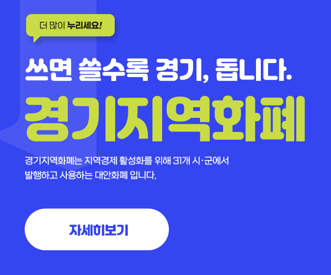 경기지역화폐 카드와 홈페이지를 적극 활용하여 지역 상권에 기여하고, 나아가 경기지역의 경제 발전을 함께 도모하는 미래를 만들어 나가시길 바랍니다.