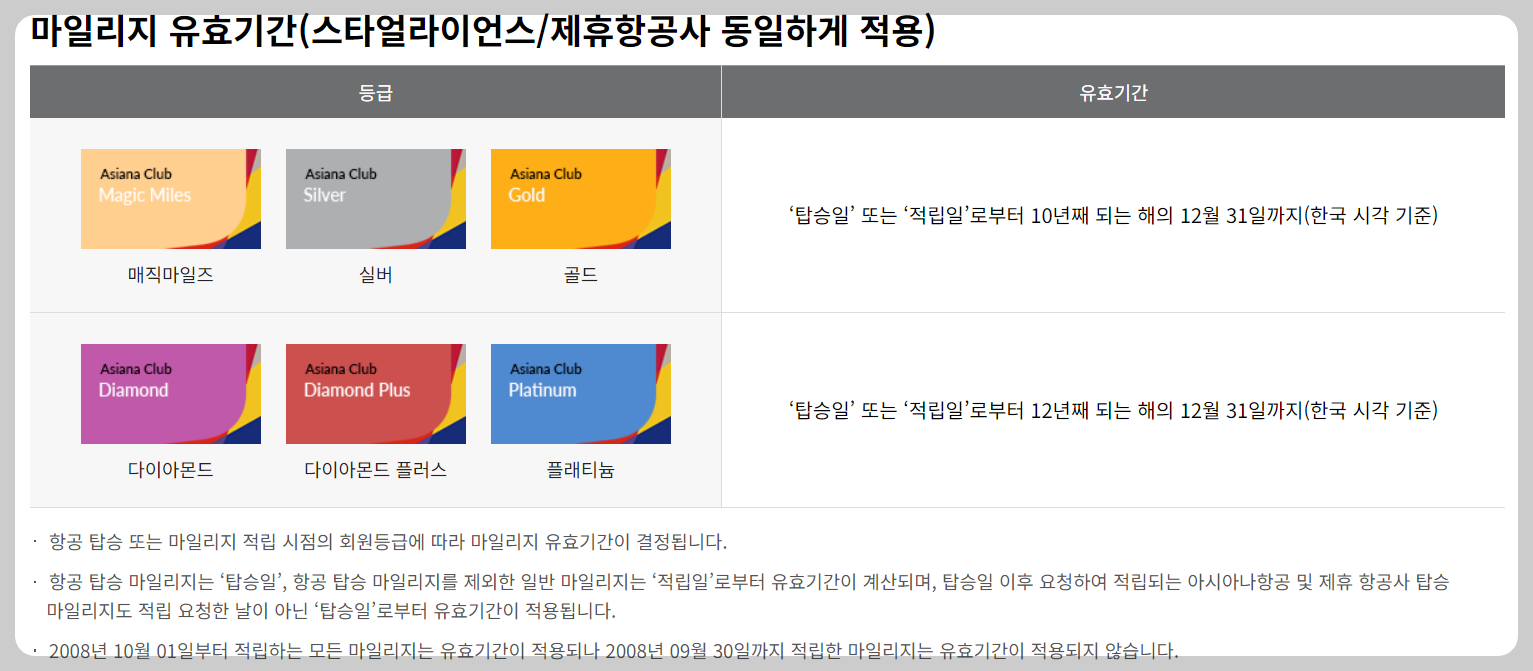 아시아나 마일리지 기한은 회원 등급에 따라 다소 다르게 적용됩니다.